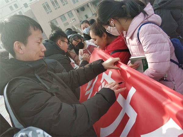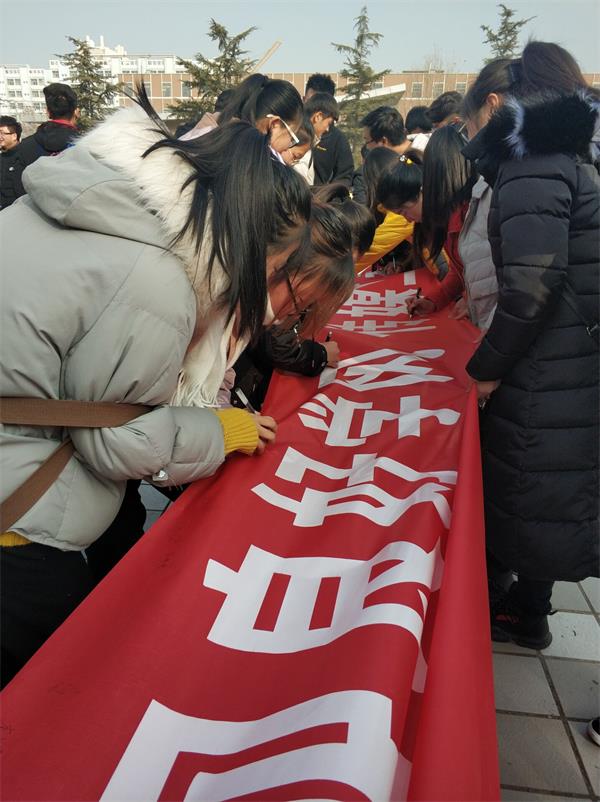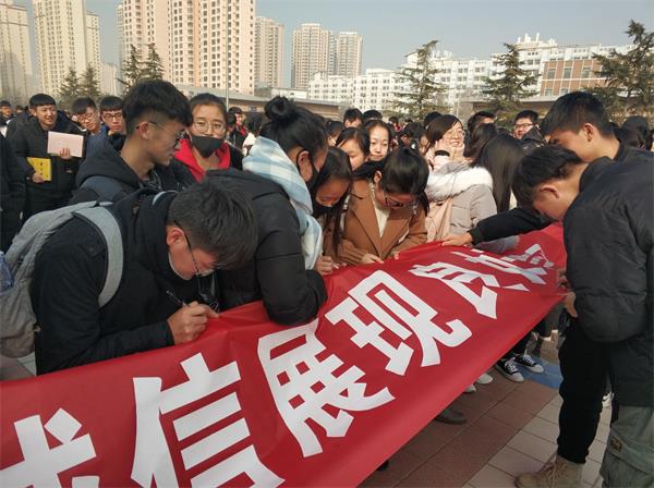 为了树立老员工诚信品质,营造优良学风考风,2019年1月2日中午12时,伟德体育在安亭广场举行了“以实力争取优异成绩,以诚信展现良好学风”的诚信考试签名活动。公司副经理杜萍、学工办副主任郝立元、辅导员曹红霞及公司全体员工参加了活动。