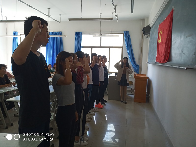 2019年9月11日,员工第一党支部举行入党宣誓仪式。员工第一党支部高雅孺等11名新党员在辅导员老师邵盈鑫带领下,面对党旗,庄严宣誓。