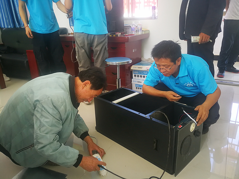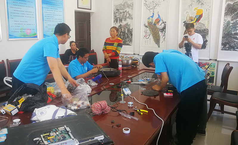 8月24日上午,小分队来到桐川镇高庄村。一进村委会,就看见村民们拉着电视机、冰箱在等候。队员们迅速投入维修工作中。孔繁庭教授还利用工作空隙,带领员工深入村民家中,帮助解决电视信号接收问题。当天共为高庄村维修电视机7台,冰箱3台,电饭锅3个,热水器9个,共计22件家用电器。
