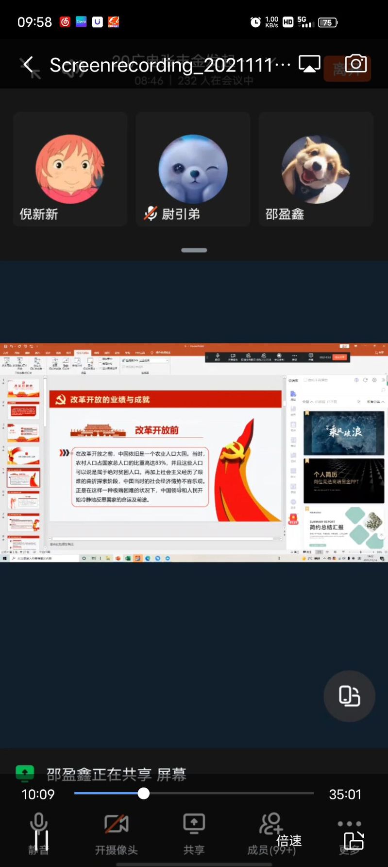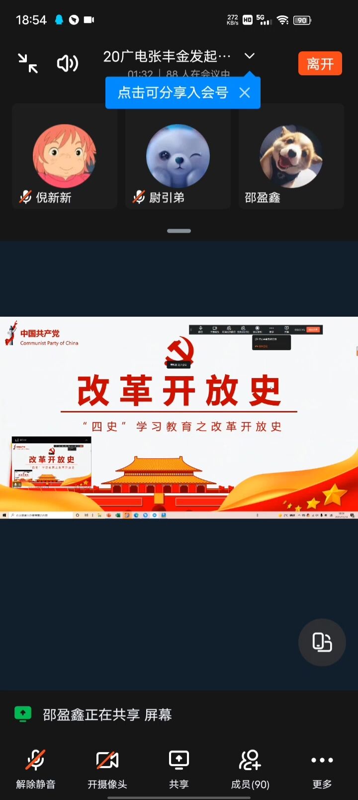 2021年11月14日和11月15日公司分别组织2019级、2020级和2021级员工通过钉钉会议开展主题为“‘四史’学习教育之改革开放史”的形势与政策课,由邵盈鑫老师主讲。