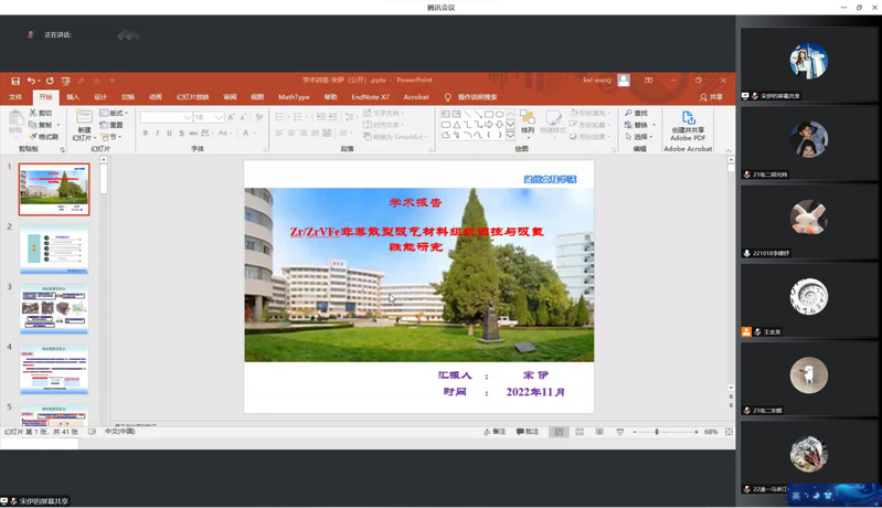 2022年11月17日下午,中国空间技术研究院博士宋伊在腾讯会议,线上为公司师生做了题为《Zr/ZrVFe非蒸散型吸气材料组织调控与吸氢性能研究》的学术报告,部分教师及300名员工参与了本场线上学术报告会。