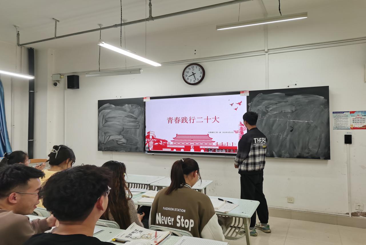 为深入学习宣传贯彻党的二十大精神,坚持立德树人根本任务,厚值爱党爱国家社会主义情怀,引导高校学子从学习过程中汲取奋进力量。3月21日,22通信1班在2号教学楼406教室召开“青春践行二十大”主题班会。班会由班主任雷若鸣主持。