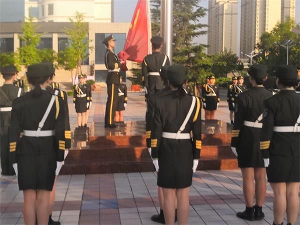 7点整,国旗护卫队的旗手们着装整齐,迈着矫健的步伐,护着鲜艳的五星红旗入场举行升旗仪式。伴着《义勇军进行曲》的响起,全体唱国歌、行注目礼,庄严肃穆。
